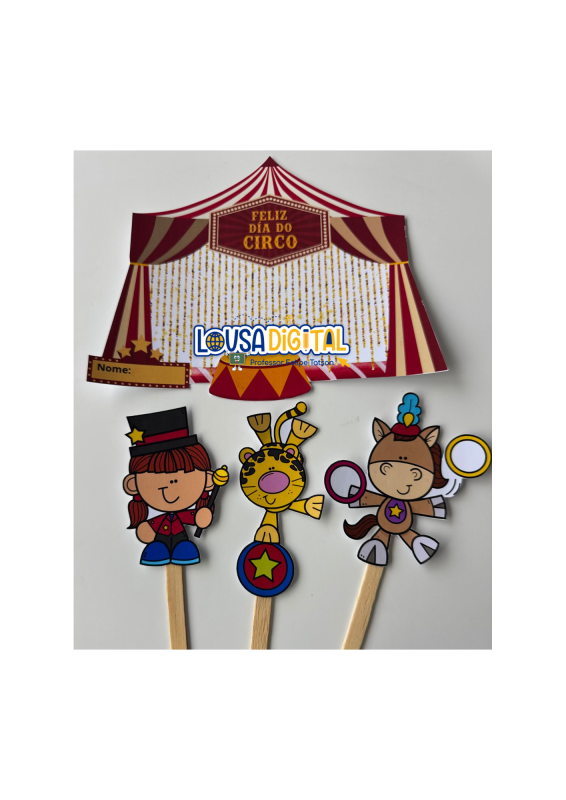 O material inclui um cenário de circo colorido e personagens em palito (como artista do circo e animais), que podem ser recortados e utilizados pelos alunos para montar e apresentar suas próprias histórias.